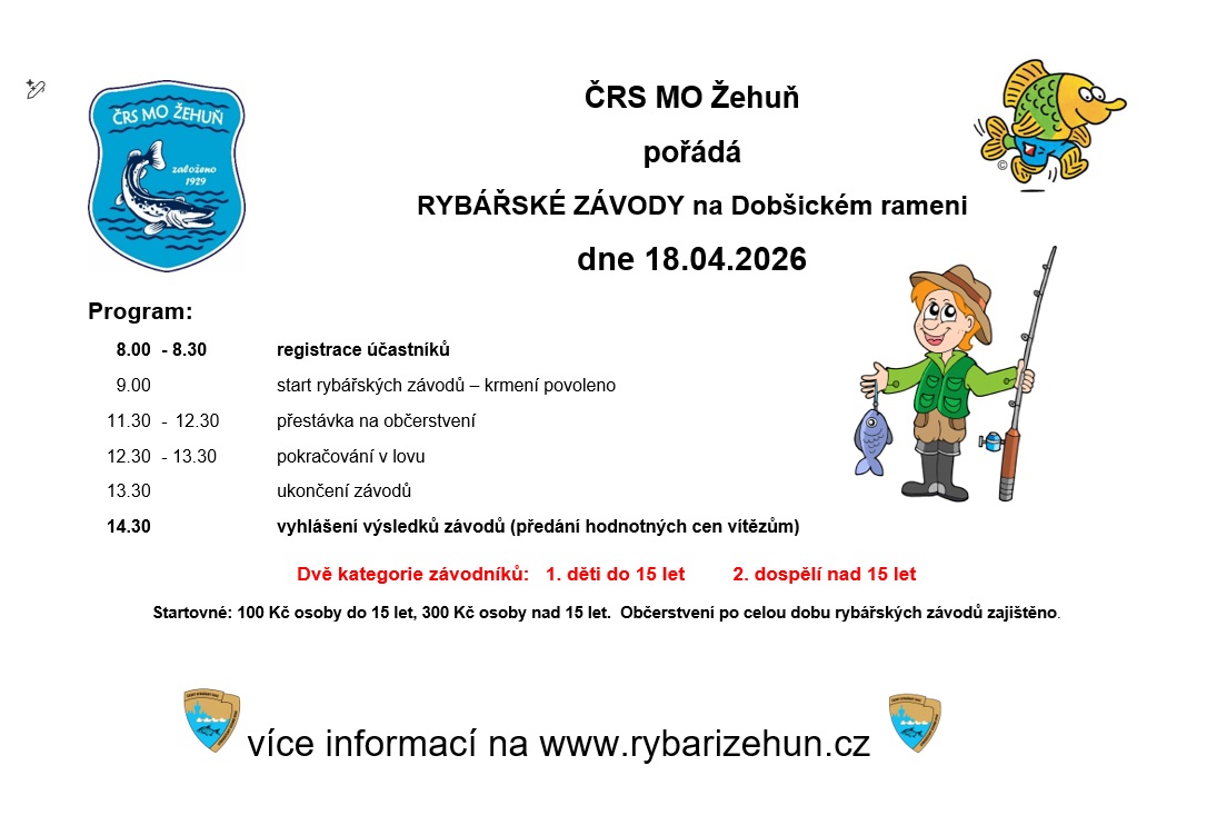 Tradiční rybářské závody na Dobšickém rameni v obci Dobšice, se uskuteční dne 18.04.2026 – propozice závodů a podrobný harmonogram závodů, bude uveřejněn na webových stránkách MO Žehuň. Těšíme se na vaši účast